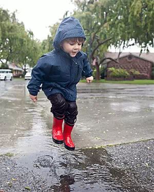 踩水坑。有时,越简单的游戏,越让孩子着迷,踩水坑就是其中之一。你有没有过这样的苦恼?孩子发现一滩水后,立刻冲过去起劲儿地踩起来,你让他别踩,他反倒更起劲!所以,不如索性在下雨天,用雨衣、雨鞋给孩子全副武装起来,让他尽情地踩水坑,你甚至可以加入他的游戏,看谁溅出的水花更高、更远。