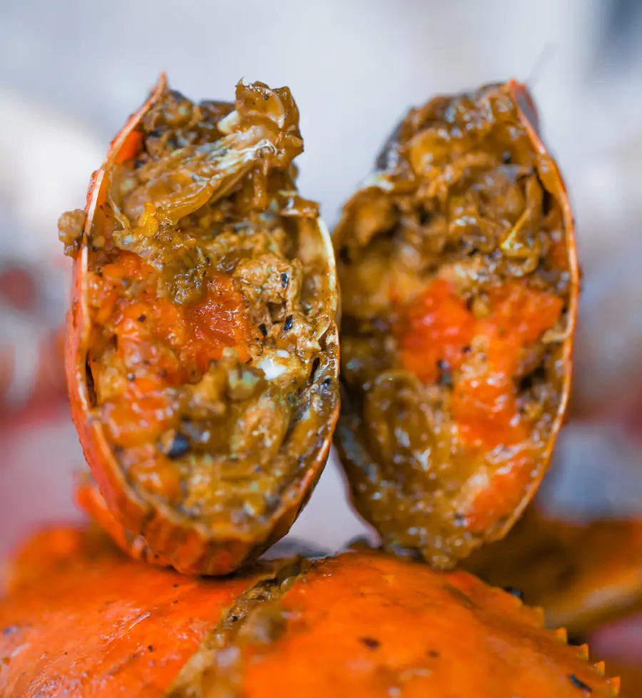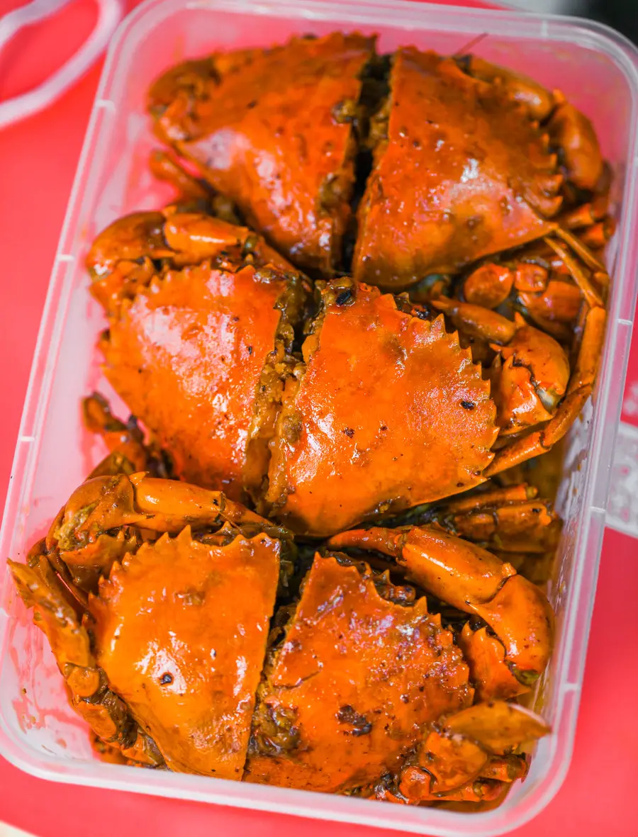 看图!蟹膏多得离谱,蟹肉全都吸收了辣汁的精华,霸道的味道充斥整条街,捧着它都感受到途人火辣的目光啊!