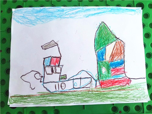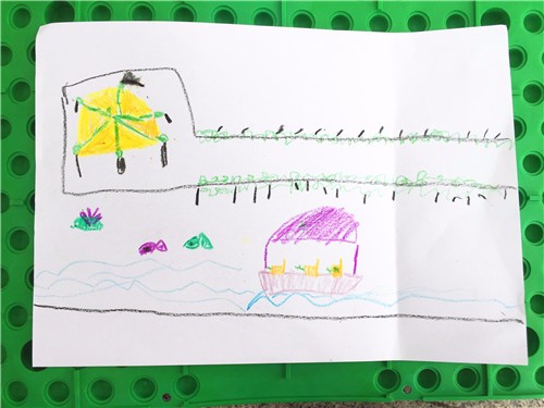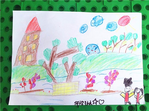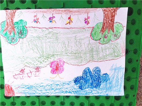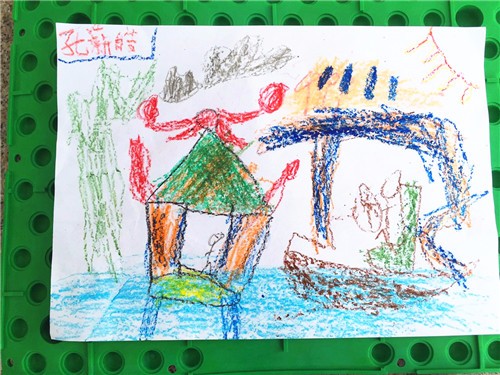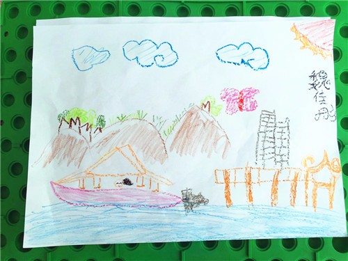 画画功底已经显现啦,树木花草和船,蜡笔绘出风景