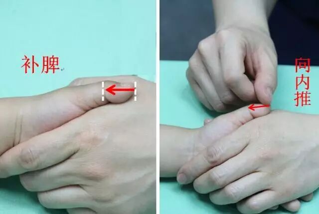 【操作】操作者左手虎口轻轻夹住宝宝左手拇指关节部位(以宝宝左手为例,双手均可操作,每次只做一侧即可),防止孩子关节弯曲,充分暴露穴位点。右手以拇指外侧缘或指腹部接触宝宝脾经穴位点,并有一定的按压力,力量均衡柔和,在脾经穴位区域,沿一定的方向反复推动。向内推(补脾),或向外推(清脾),或来回推(清补脾)。速度为每分钟220-280次。