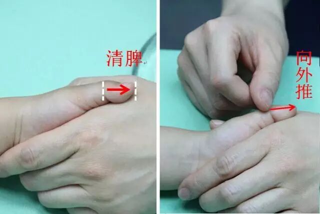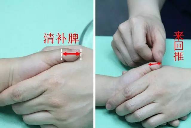 【手法】推法补脾:是补法,操作方向,由指尖向指根方向推(如图所示),用于各种虚证。清脾:是泻法,操作方向与补脾相反(如图所示),用于积食、便干、有脾胃火时;清补脾:是平补平泻法,操作方向是来回推(如图所示),用于疾病中期或分不清虚实时。