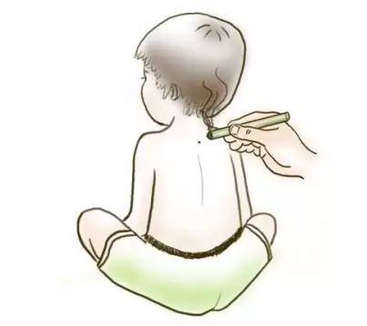 身柱穴在背部第三胸椎(肩背正中央最高脊椎骨下第三个椎骨)棘突下,取穴时,使孩子自然正坐平肩,略向前低头,在第三胸椎下陷中取之。