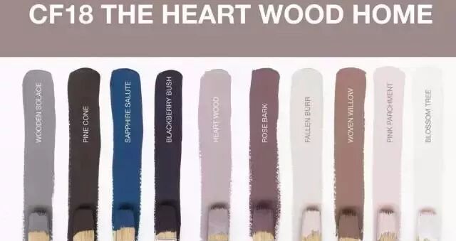 颜色从左到右依次为:木质安抚色,松果色,宝石墨蓝,蓝莓紫,心木色,玫瑰树皮色,毛刺白,编织柳棕,羊皮纸粉,树花白。