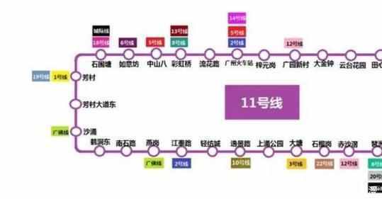根据相关规划,地铁11号线预计建成时间为2022年,建成后将实现与广州整个放射型的地铁线网交会,加密广州中心城区线网,强化中心城区与外围的联系,有利于市中心外围居民的换乘,缓解城市交通拥堵状况。届时将与广州一、二、三、五、六、八、十、十二、十三、十四、十九、二十一号线及广佛线换乘,只要坐上十一号线,一小时左右就可以环绕全城。