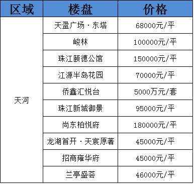 天河区的房价最是起伏不定,靠近中心商圈的楼盘,基本走的都是高冷的豪宅路线,单价10万+以上的楼盘不少,而稍微便宜的楼盘则集中在偏远的牛奶厂,基本在4-5万/平区间。