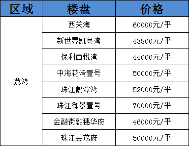 荔湾的房价大部分都在4-5万元/平区间,分布在广钢和滘口等地方,还有比较高价位的江景楼盘西关海和珠江御景壹号。