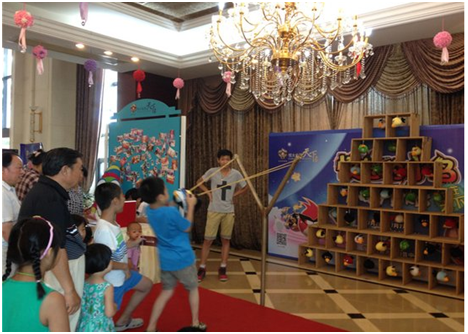 设置大型弹弓射击小鸟的游戏摊位,有游戏资格票的客户参与可获印花任务卡分数,参与游戏互动。