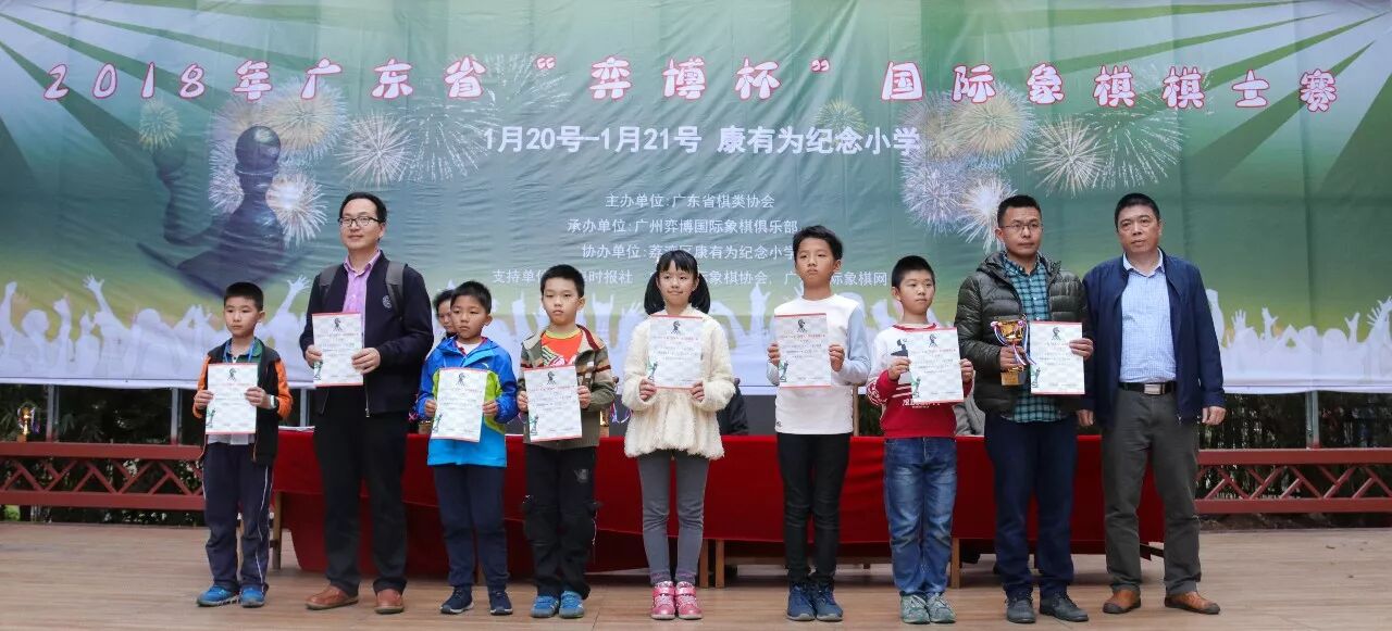 赛后举行的颁奖典礼上,广东省棋类协会国际象棋主教练梁金荣先生、广州市国际象棋协会副主席文根洪先生、广州市国际象棋协会秘书长吴维忠先生、广州市国际象棋协会副主席邝幸姬女士及康有为纪念小学刘婉莉主任分别为获奖棋手颁奖。