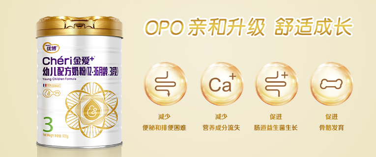 众所周知,婴幼儿时期肠胃发育不完善,稍不留神就容易出现腹胀、便秘的情况,优博金爱+奶粉OPO配方能够帮助宝宝更好的吸收和消化营养,有效减低盖皂产生的可能,增加宝宝大便的柔软度,减少便秘的发生几率,避免宝宝上火.