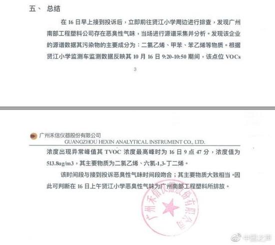曾胜告诉中国之声记者:“经11月16日9:20至10:50时段进行溯源分析,该时段内,贤江小学主要受到南部工程塑料公司的影响,经专业机构检测其有机废气贡献率为91.80%。”