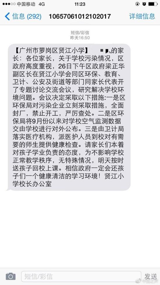 对此,学校方面在本周一发给学生家长的通知中称,区环保局已经对学校周边污染企业采取措施,请家长们本着对学生负责的态度,无特殊情况,按时送孩子回校上课。