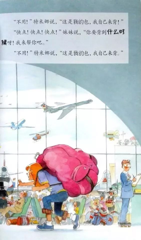 背包里塞满了玩具变得很沉,特米娜背着这么重的背包走得很慢,妹妹想要帮忙,但特米娜却说:“不用,这是我自己的背包,我要自己背。”