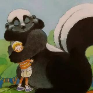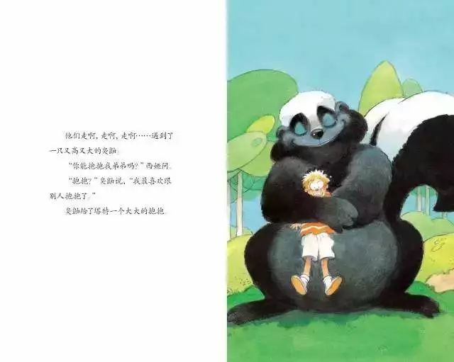 《抱抱》书的封面上画的是一只巨大的臭鼬,很幸福的抱着一个小男孩,他们微笑着,是不是有点奇怪?在他们之间发生了什么故事?