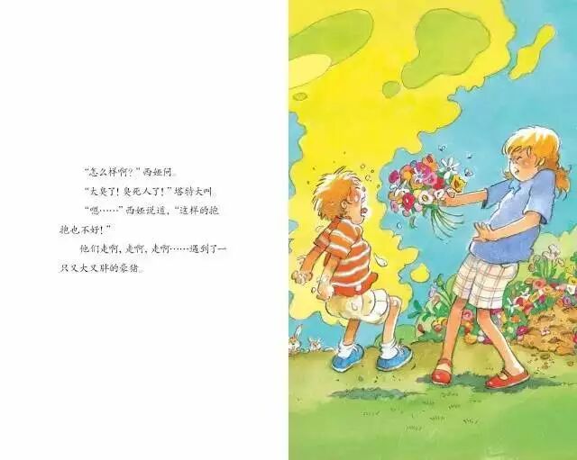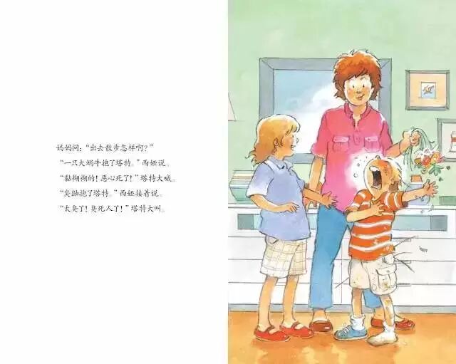 被臭鼬抱着的小男孩名字叫塔特,故事讲的是塔特的姐姐西娅很生妈妈的气,于是拉着塔特从家里跑了出去。走了很久,塔特累了想要抱抱,西娅抱了一下,可是塔特说想要一个不一样的抱抱,于是西娅带着他去寻找不一样的抱抱。