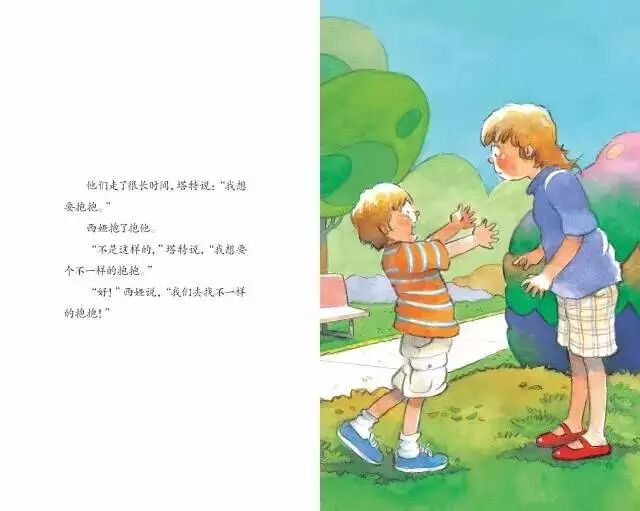 塔特走累了,对着姐姐西娅说:“我想要抱抱”。西娅抱了抱塔特,不过塔特却想要不一样的抱抱,于是姐弟俩开始去寻找不一样的抱抱。