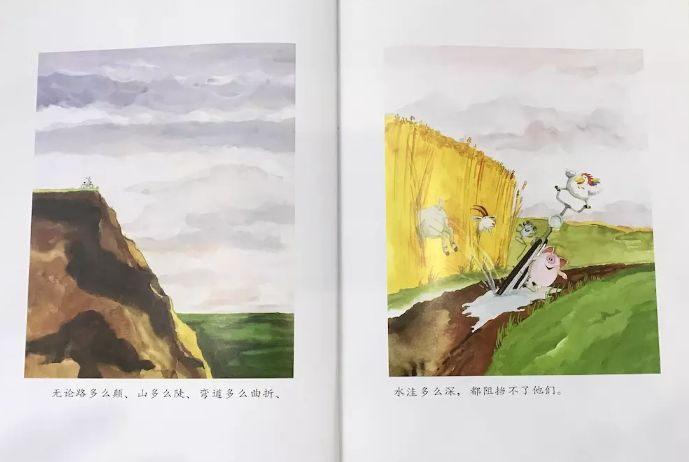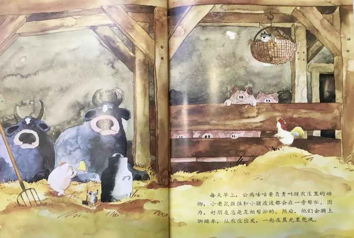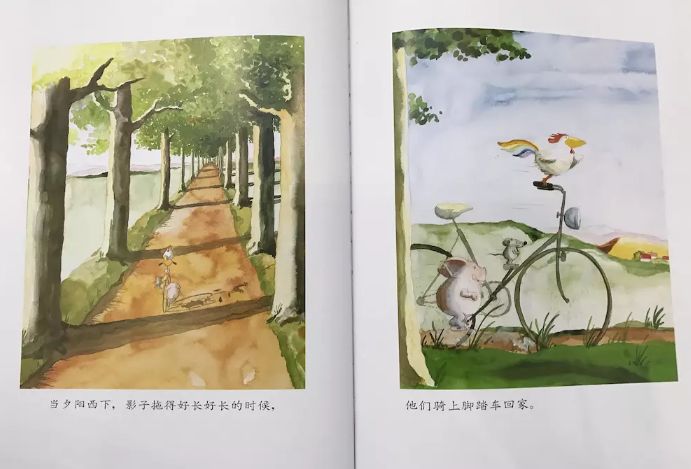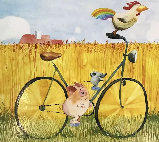 《好朋友》是德国作家赫姆·海恩的作品,绘本以水彩画为基调,色彩明亮且温暖。在故事里有三个好朋友,分别是小鸡、小猪和小老鼠,他们一起骑着一辆自行车,小鸡呢负责控制方向,小猪和小老鼠分别站在两个踏板上,上下有节奏地踩着踏板,让车轮缓缓向前。