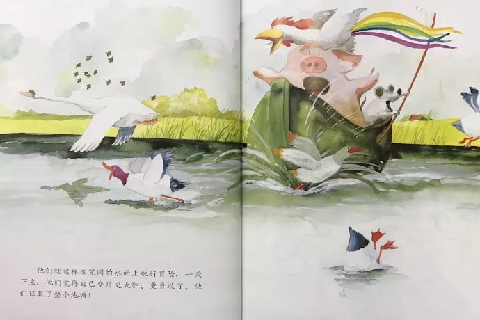 在宽阔的水面上,三个好朋友齐心协力在池塘里冒险航行,一天下来,他们觉得自己变得更大胆、更勇敢了。他们征服了整个池塘!