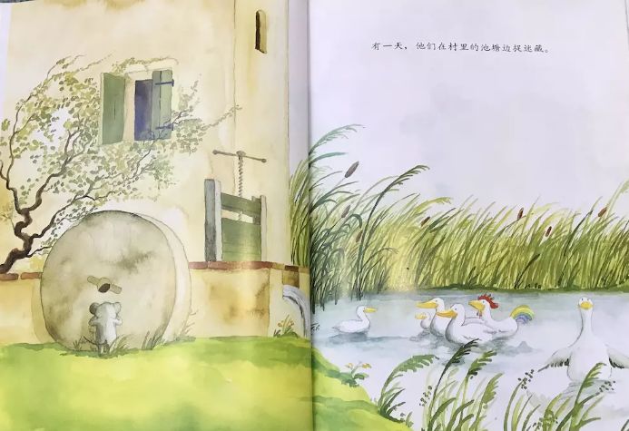 有一天,小鸡咕咕,小老鼠强强,小猪波波,三个好朋友在村里的池塘边玩起了捉迷藏。
