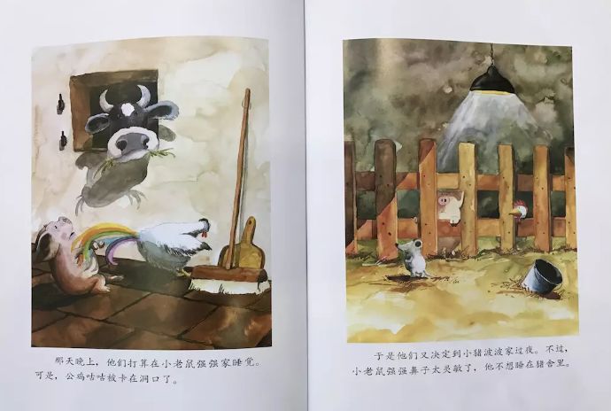 那天晚上,他们打算在小老鼠强强家睡觉。可是小鸡咕咕进不去,被卡在洞口了。于是他们又决定到小猪波波家过夜。不过,小老鼠强强鼻子太灵敏了,他们不想睡在猪舍里。
