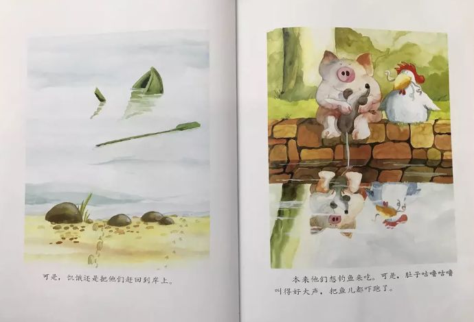 可是,因为太饿了,他们只好回到岸上。想吃鱼,但是肚子饿得咕噜咕噜叫,好大声,把鱼儿都吓跑了。