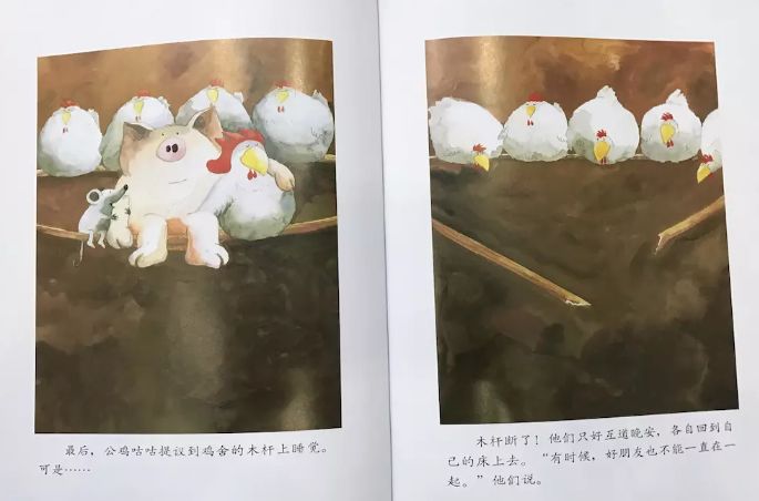 最后,小鸡咕咕建议去她的鸡舍睡觉,当三个好朋友坐在鸡舍的木杆上准备睡觉时……木杆断了!他们只好互道晚安,各自回到自己的床上去。“有时候,好朋友也不能一直在一起。”他们说。