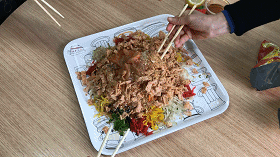 怎么捞?其实很简单,就是用筷子将各种食材高高挑起,搅混即可。
