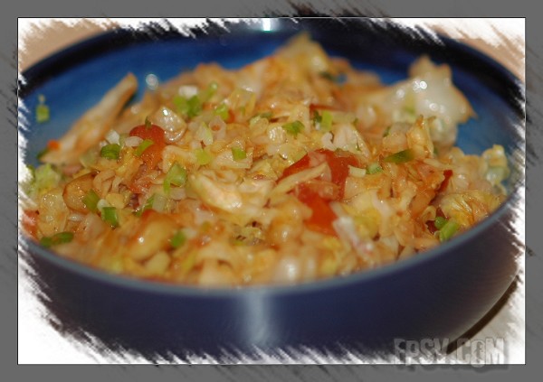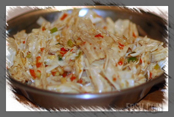 没了干辣椒粉,抽屉里珍藏着亲戚从HN带来的红尖椒,于是灵光一闪,碾碎、加点盐、鸡精、葱花以及孜然,烧点热油淋在上面,临时炮制了一点油辣椒,拌在里面,味道那是相当的。。。绝!