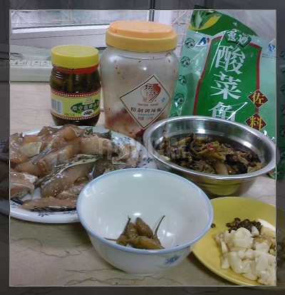 现成的酸菜鱼用的酸菜-用1/3即可(原来里面还配有汤料的,用它连鱼都不用腌制了,可惜自己事先腌好了。。。配料下回再试试吧)