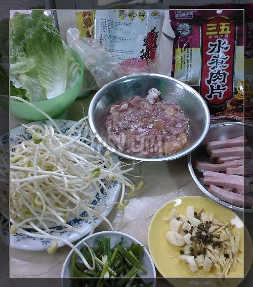 步骤:热锅热油先将姜丝、蒜瓣、花椒煸炒片刻,加入水煮肉片的调料(1/3包)煸炒,放入豆芽煸炒至8成熟,再放入生菜煸炒至8成熟,即可捞起放入碗中打底