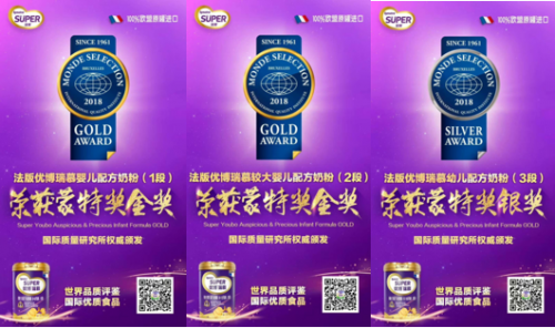 圣元法版优博瑞慕奶粉喜获蒙特奖,又称世界品质评鉴大会,被誉为质届的“奥斯卡”。蒙特奖(MONDE SELECTION),又称“世界品质评鉴大会”,始建于1961年,是国际品质评价组织,专为具代表性的世界性产品进行的品质评鉴。其按照欧盟、美国、日本等全球最严格的法律法规严格评审,被誉为质量界的“奥斯卡”。而2018年,经过层层筛选,在蒙特奖颁奖典礼上,圣元法版优博瑞慕奶粉的三款产品都喜获嘉奖!
