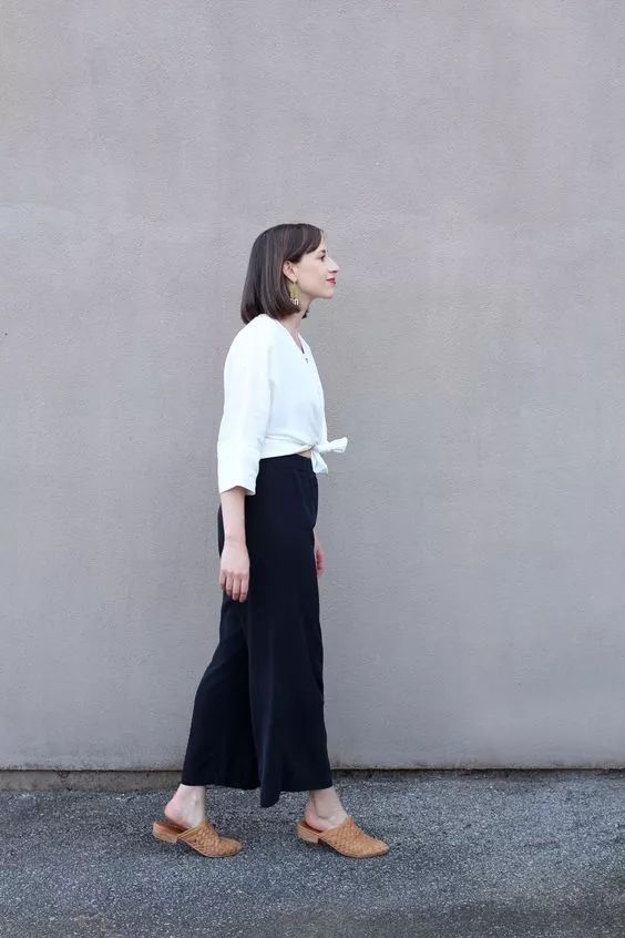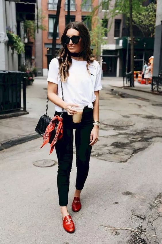 夏天上衣单品以素色居多,下装多以蓝色、黑色等基础色居多,建议搭配一双浅色乐福鞋,为造型增加亮点与吸睛点。
