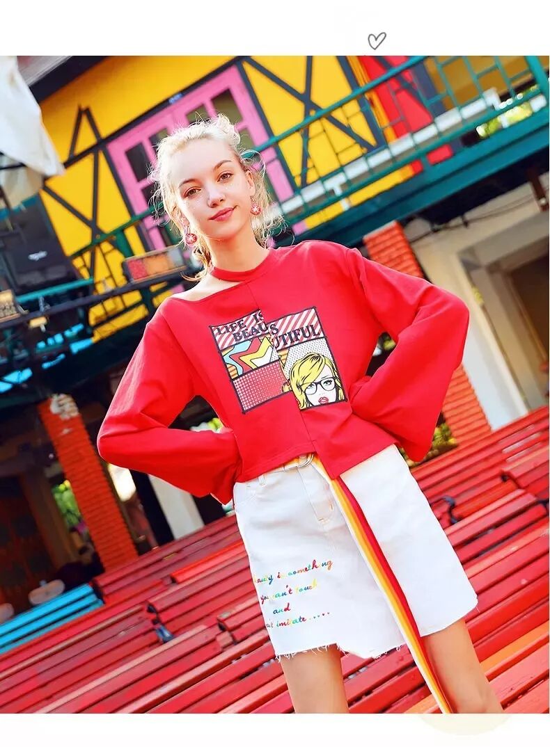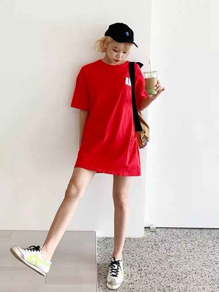 ▼这件辣椒红T恤,宽松直筒的版型上身很舒服,不会有太大的束缚感,搭配白色短裙清爽干净,而且白色短裙修饰腰部线条,适合各种身材的妹妹穿搭。