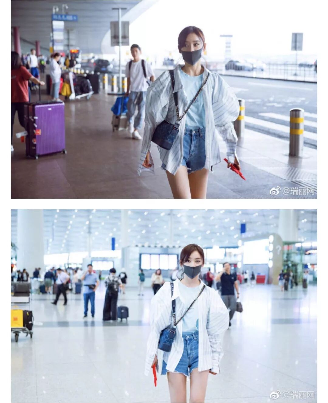 ▼袁姗姗穿淡蓝色T恤搭配天蓝色牛仔短裤,清新活力满满的夏日气息。