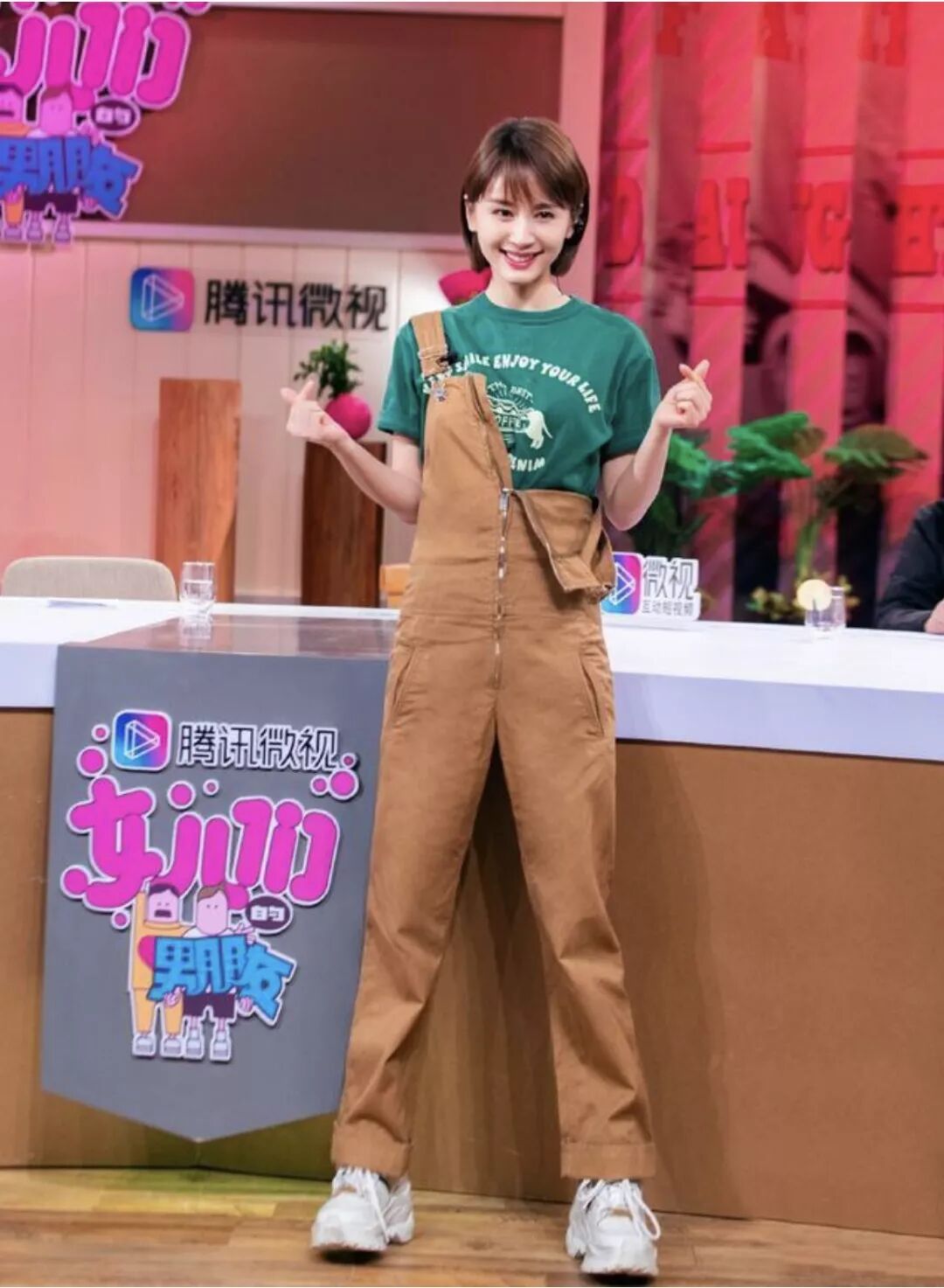 ▼王子文穿的绿色T恤,搭配了一条卡其色的背带~看上去显得十分的清新动人。