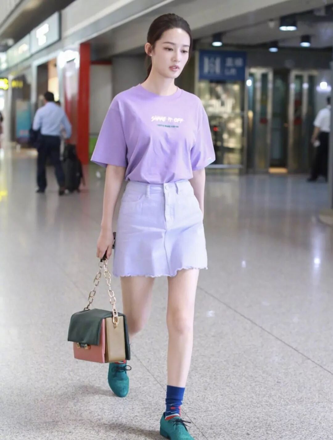 ▼李沁清新紫色短t搭配相同色系的毛边高腰A字牛仔裙的穿法,实在是让我大开眼界!再配上大麻花辫,清新自然满屏少女气息哈~
