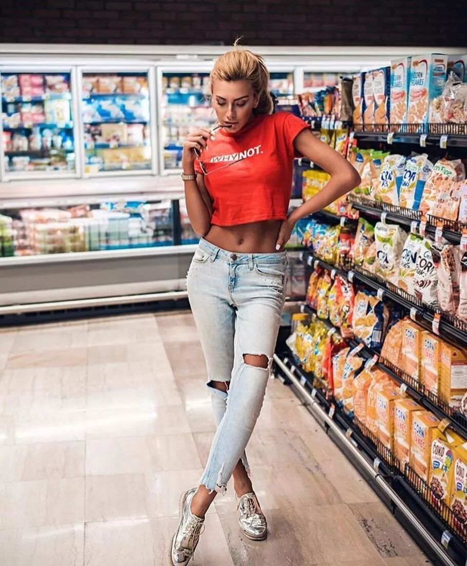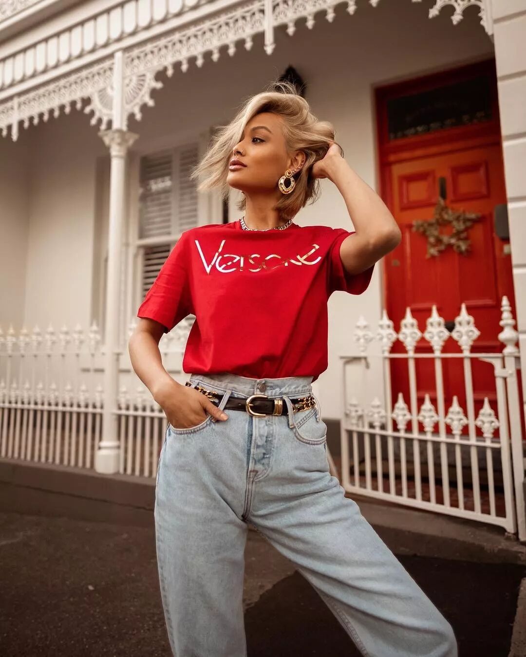▼红色T恤对于黑、白牛仔裤的驾驭力很强,与这两种颜色的拼接更加具有层次感,显得非常夺目。可以说是搭配零失误。