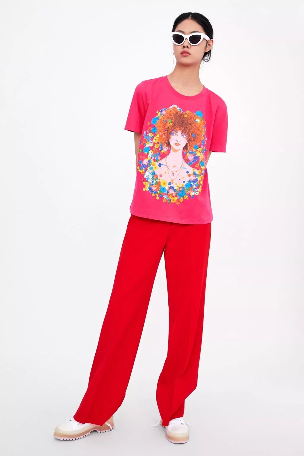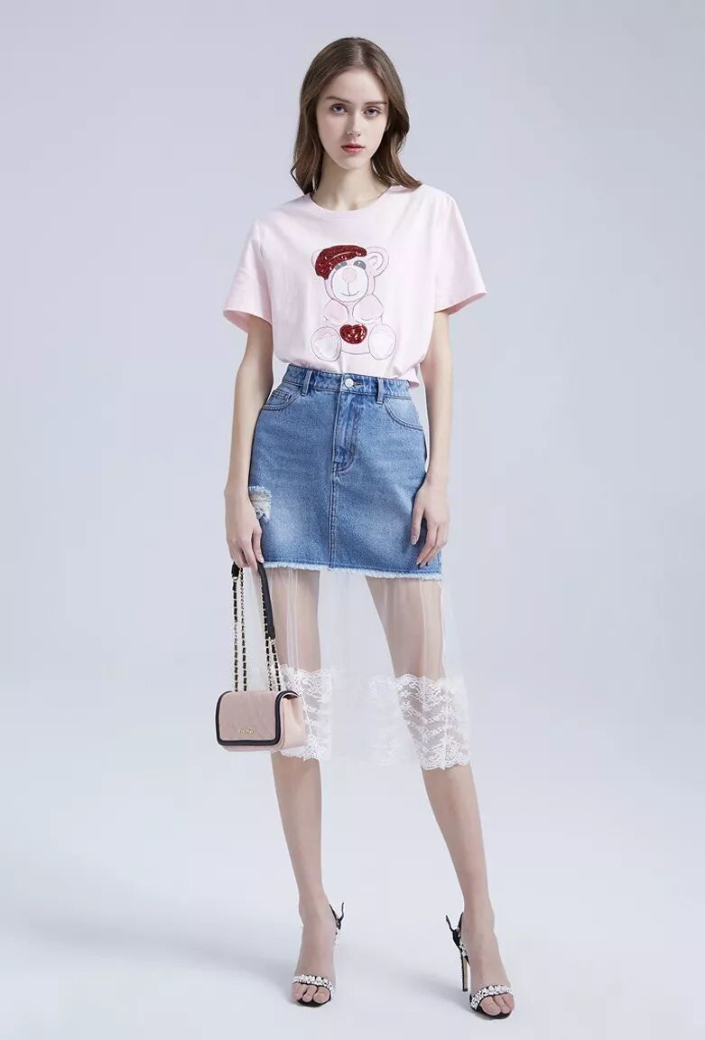 ▼明亮鲜艳的粉色T恤,充盈数不尽的热情,粉+蓝的组合,也似繁华与天空浪漫的相遇。
