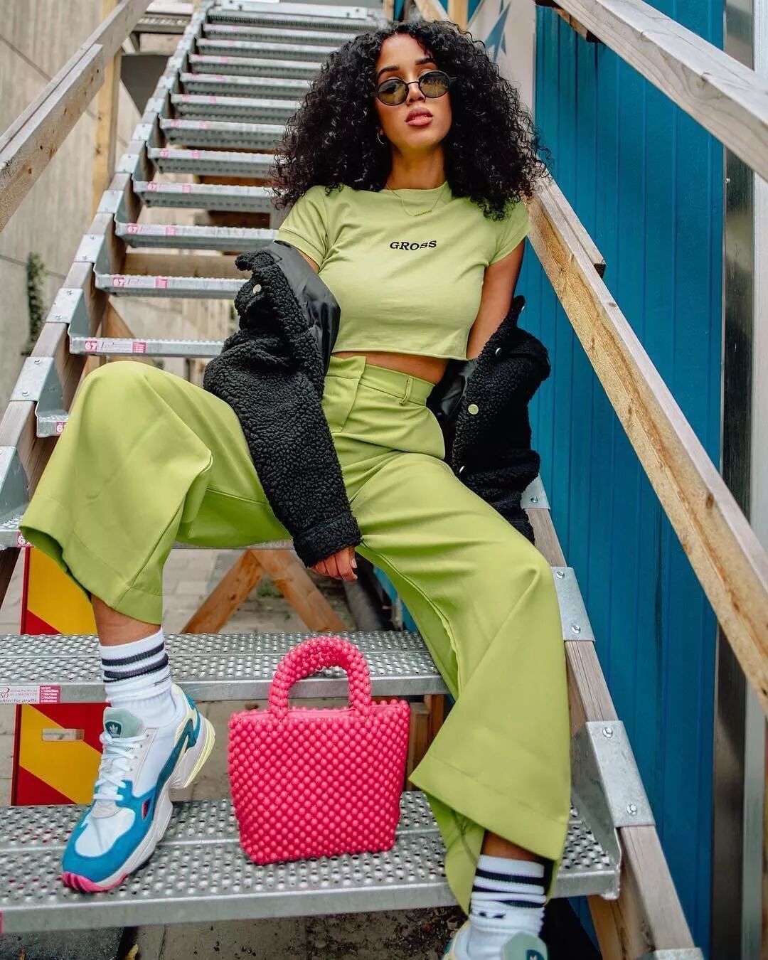 ▼孔雀绿搭配棕色直筒裤给人一种ins港味的感觉,宽松的版型加上字母贴片之类的,一种新潮十足的感觉哈~