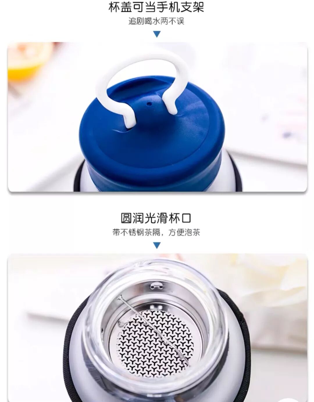 磨砂质感的杯身材质是高硼硅玻璃,杯盖是食品级pp塑料,里面还有不锈钢的茶隔。最最给力的是杯盖上面还能当手机支架!喝水同时还能看电影哦~