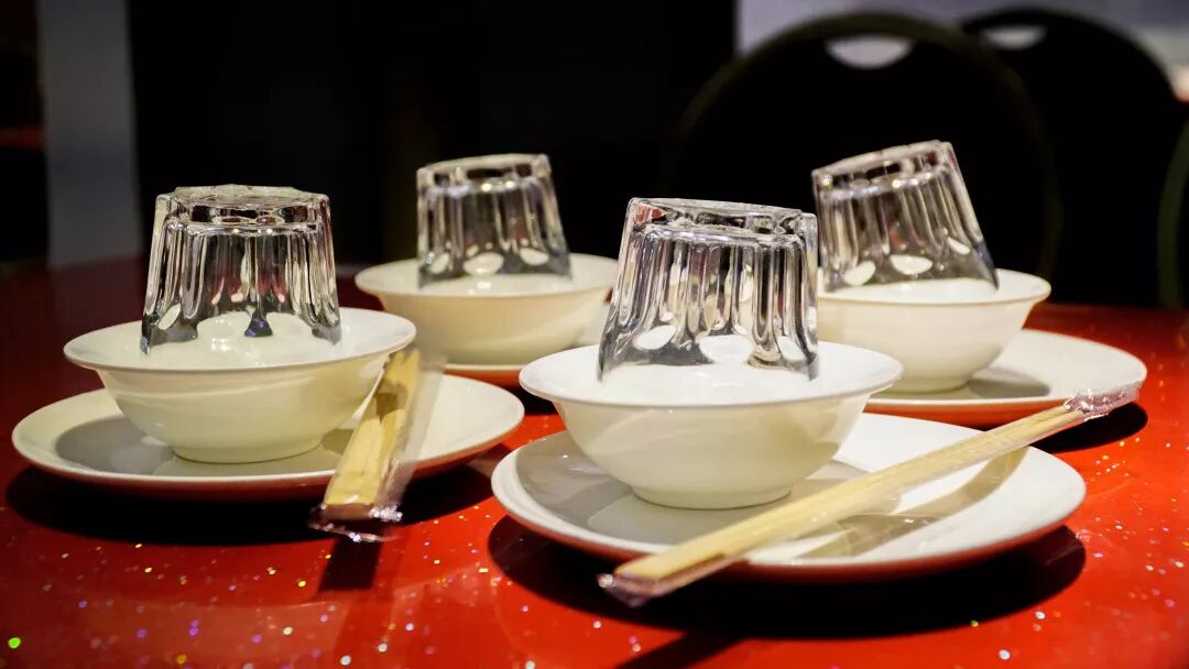 复古红的餐桌,整齐摆放的餐具,讲究得和这个地理位置的餐厅有点不太一致。
