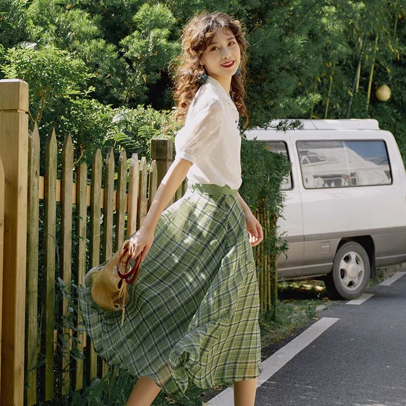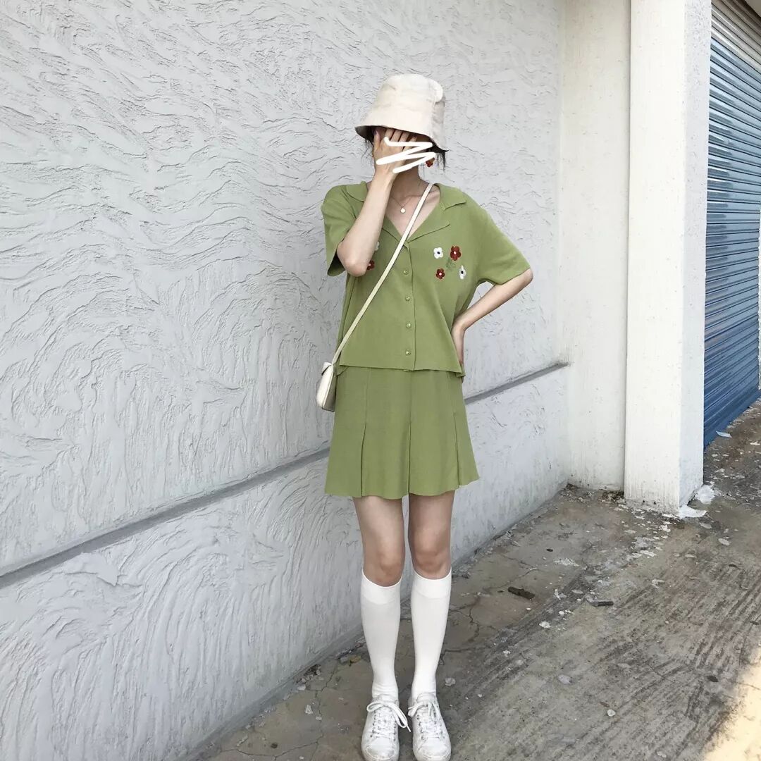 白色上衣搭配牛油果绿裙装自带温柔feel,白色小背心叠穿小裙子也是非常出彩!