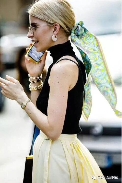 最近丝巾发饰的风很大,完全可以用twilly DIY一个独一无二的造型~随意一绑,丝巾垂下来会让整个人看起来比短发温柔。
