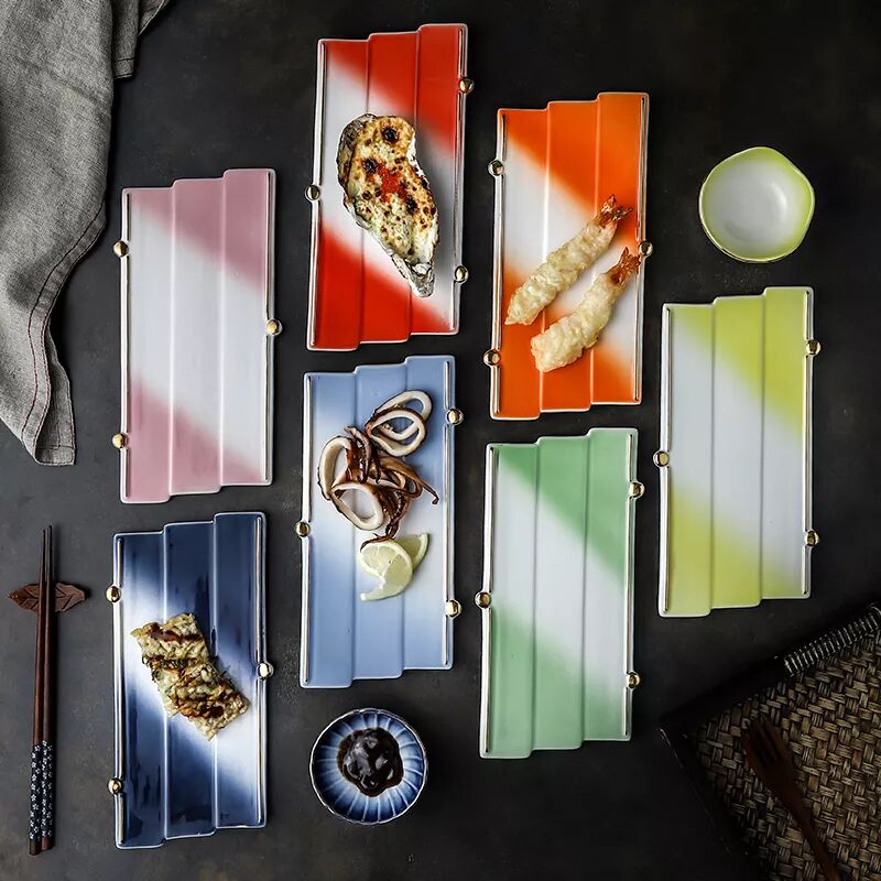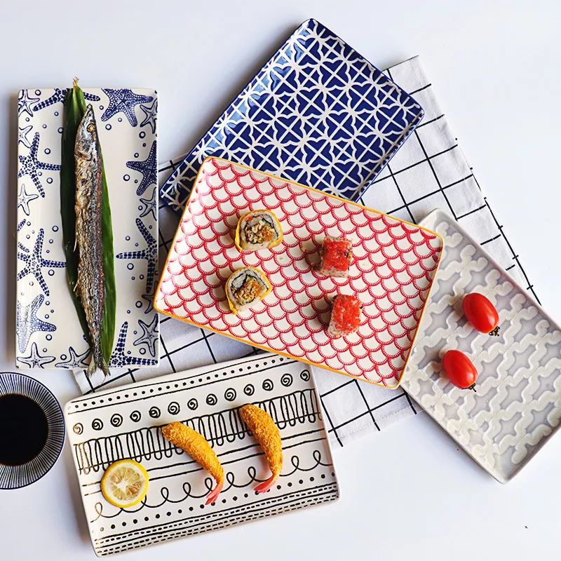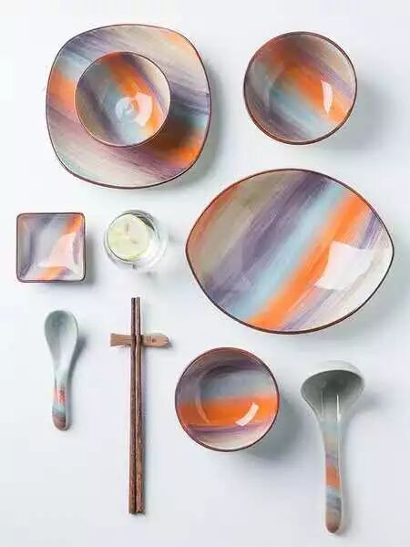 这家店主打日式复古餐具,深色系的餐居多,非常古朴有质感,跟面类、饭类主食类搭配就很好看,浅色系的不多,但是也极好看,我最喜欢有樱花印花和彩虹色的方形碟,非常适合盛寿司和小菜,不管是规则还是不规则摆放,都hin好看~