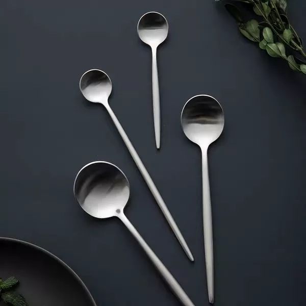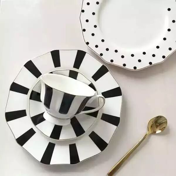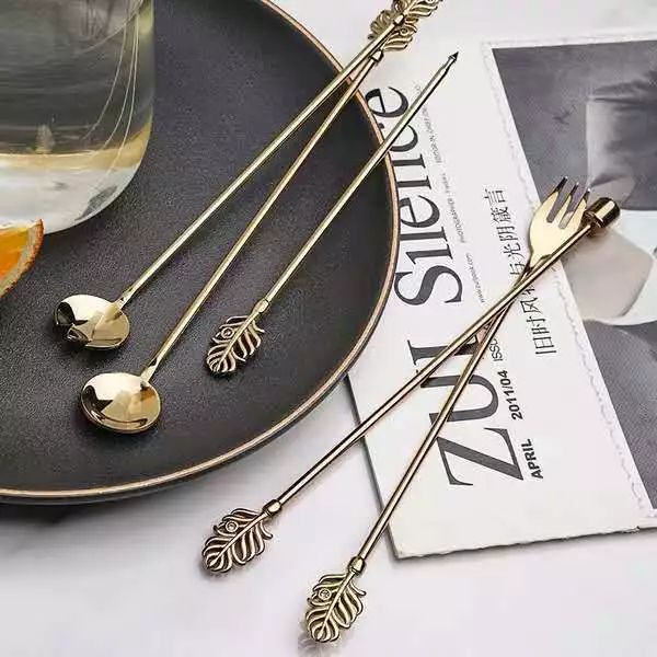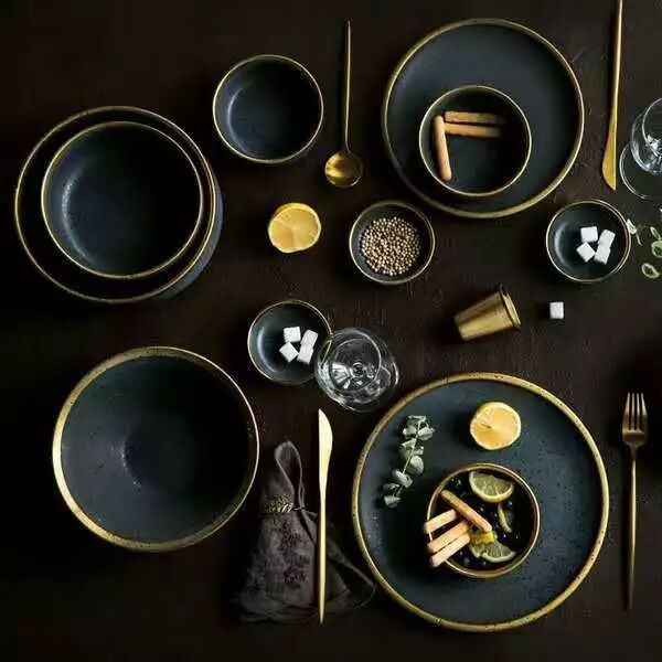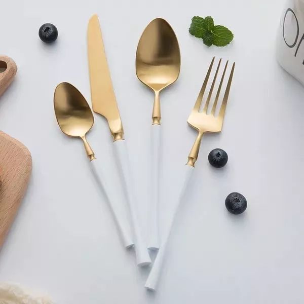 这家北欧系列专注金边设计,但是在造型上比上一家有趣得多,像椭圆和不规则型,而且是偏暖的北欧风,像它的刀叉,用了亚光银灰色,比纯银色刀叉温暖了许多,金色的刀叉在柄手部分加以白色也变高级许多!