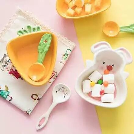 上面两家店是活泼可爱来形容,那么这家店就是少女可爱型,既有呆萌动物系列,也有少女心满满的草莓樱桃等图案的碗碟,种类比上面两家多,包括勺子,筷子架都有可爱造型,还有单独的儿童系列,其它店是没有的,非常贴心了!
