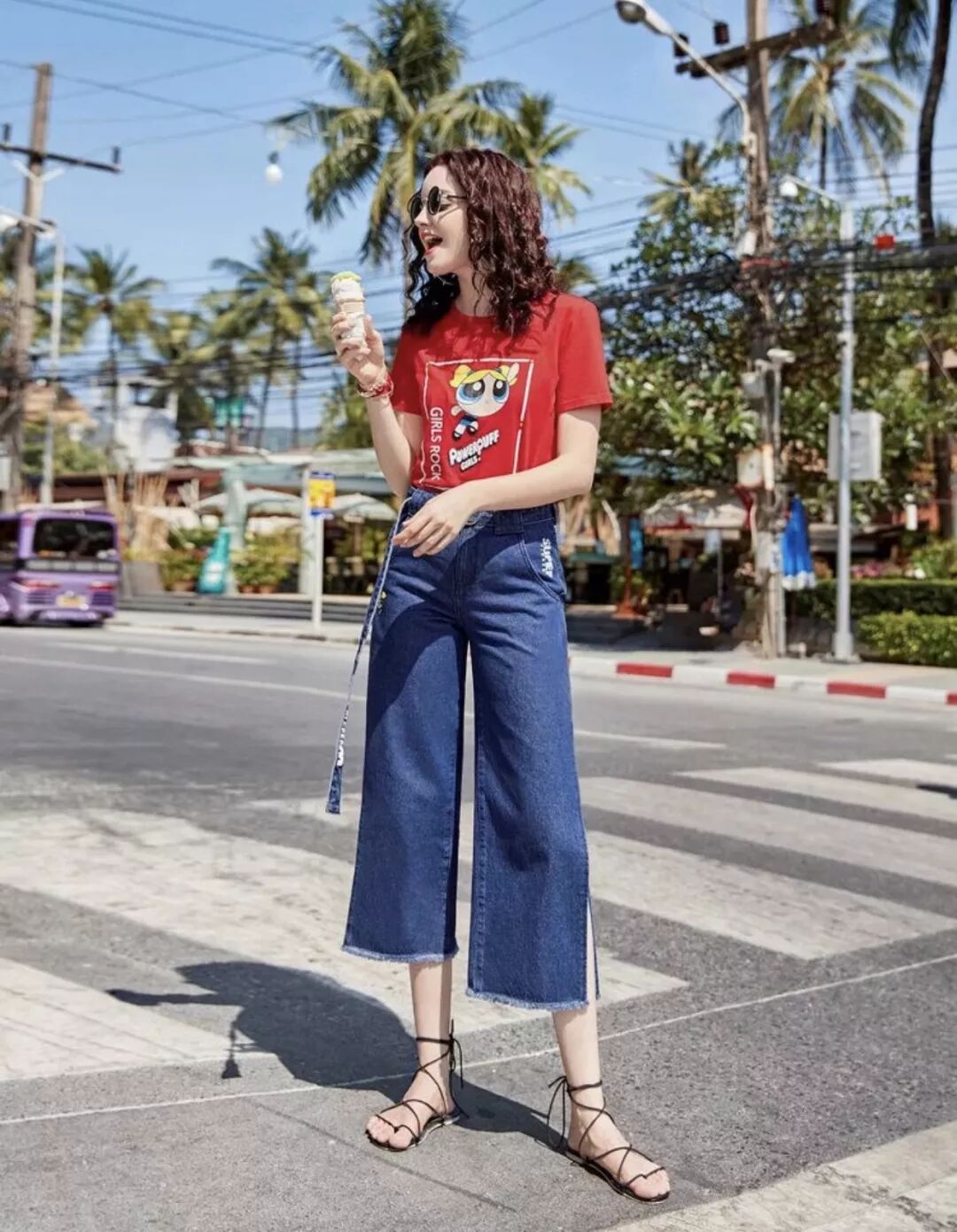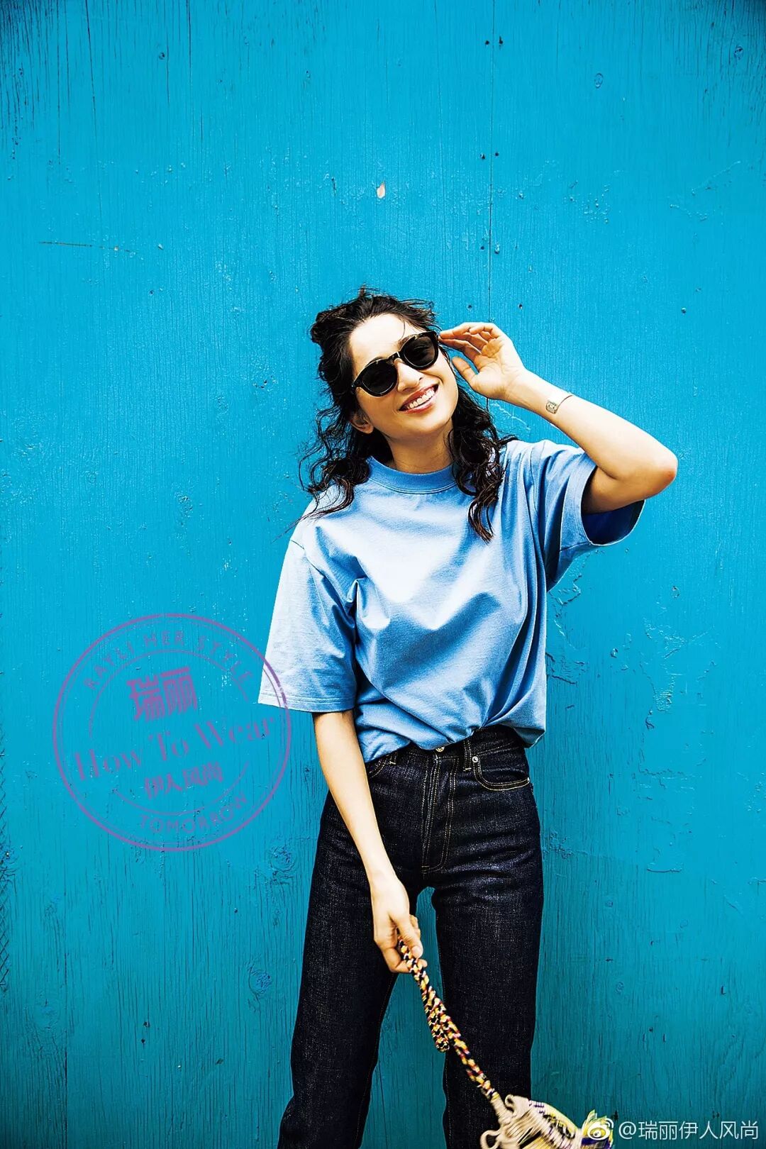 ▼袁姗姗穿淡蓝色T恤搭配天蓝色牛仔短裤,清新活力满满的夏日气息。