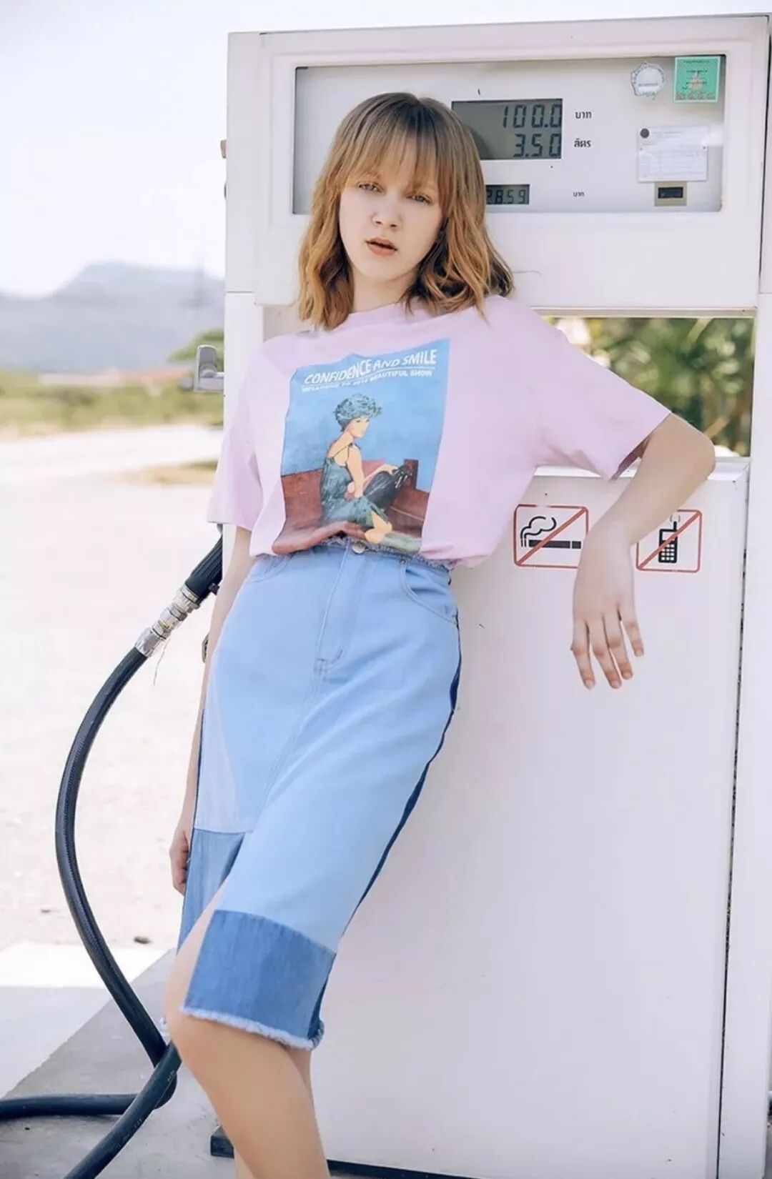 ▼李沁清新紫色短t搭配相同色系的毛边高腰A字牛仔裙的穿法,实在是让我大开眼界!再配上大麻花辫,清新自然满屏少女气息哈~