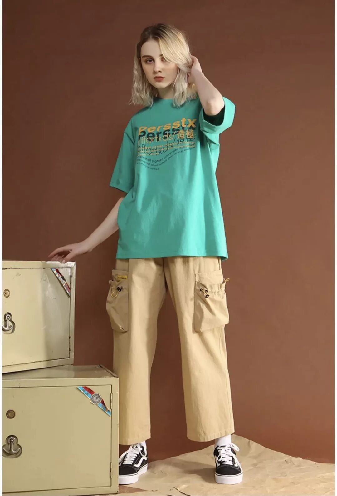 ▼孔雀绿搭配棕色直筒裤给人一种ins港味的感觉,宽松的版型加上字母贴片之类的,一种新潮十足的感觉哈~
