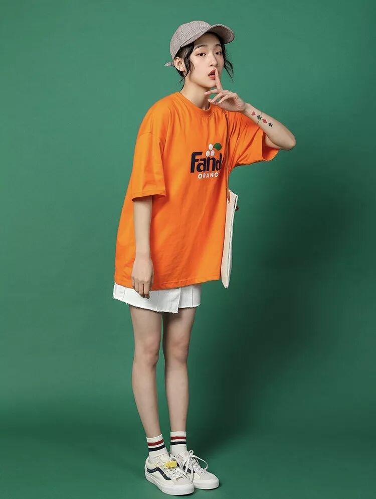 ▼虽说白色的下装搭配起来毫无压力,但是显眼的橙色T恤补色才是最抢眼、最明亮的look~,整个一套穿起来才是最好的CP结合,给人一种元气少女的感觉~