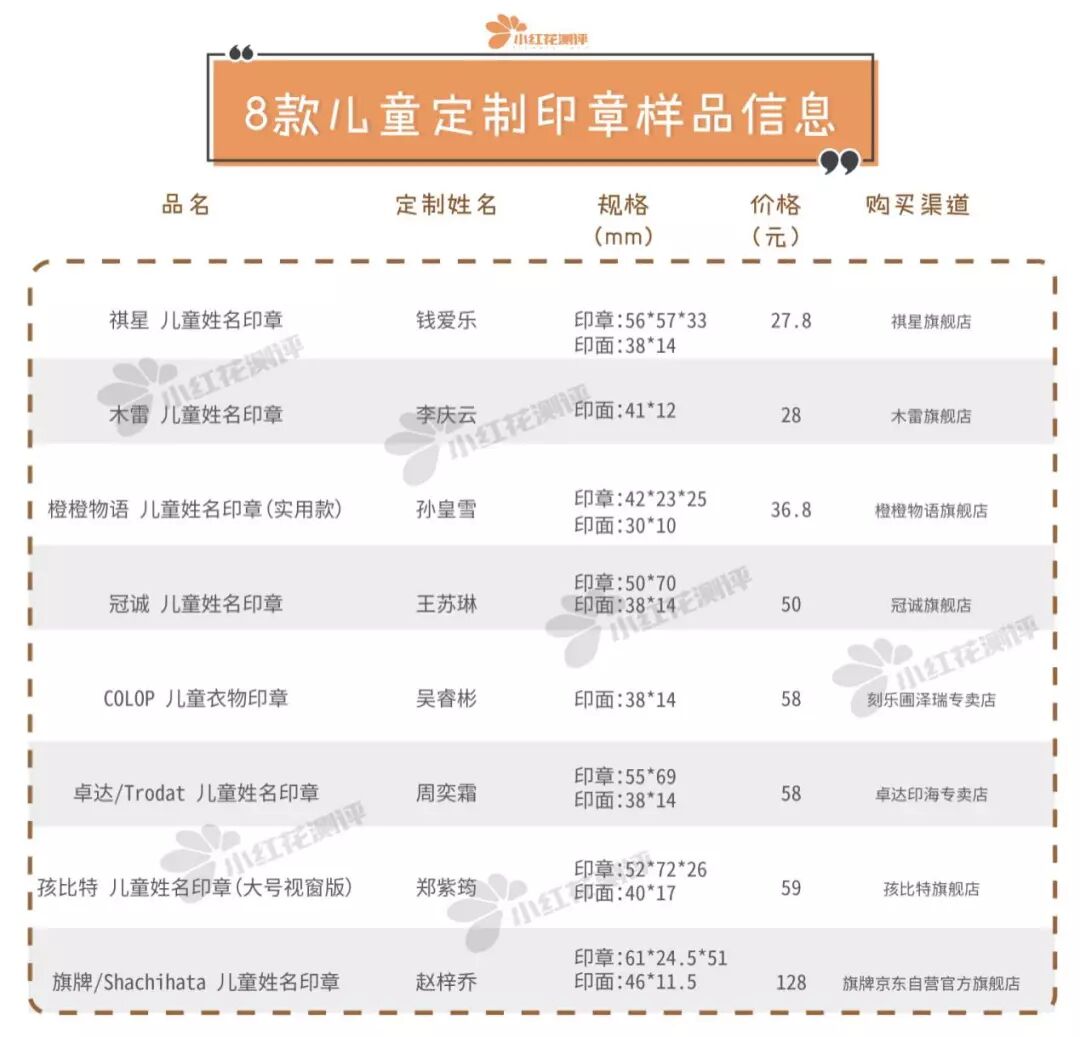 根据电商平台的销量,花花选择了以下8款儿童印章来进行测评,还分别定制了儿童姓名,方便后续对比、观察。